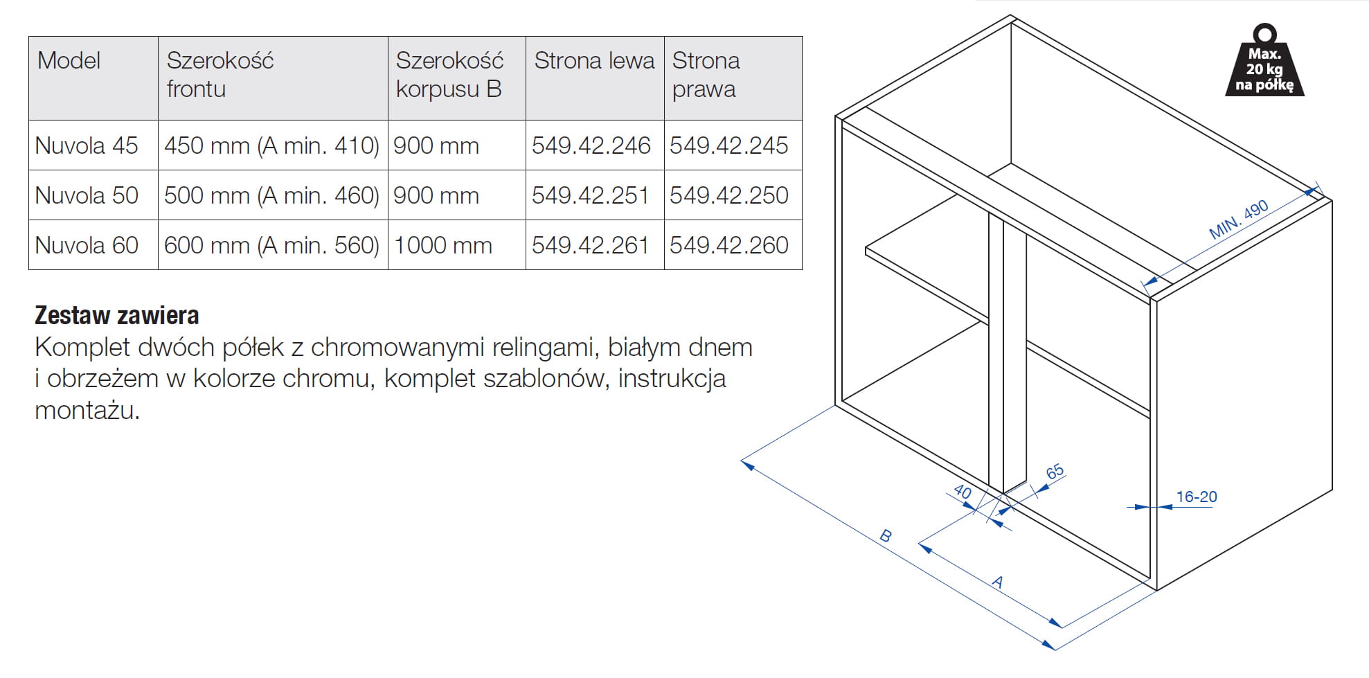 - Udźwig: 20 kg na półkę
