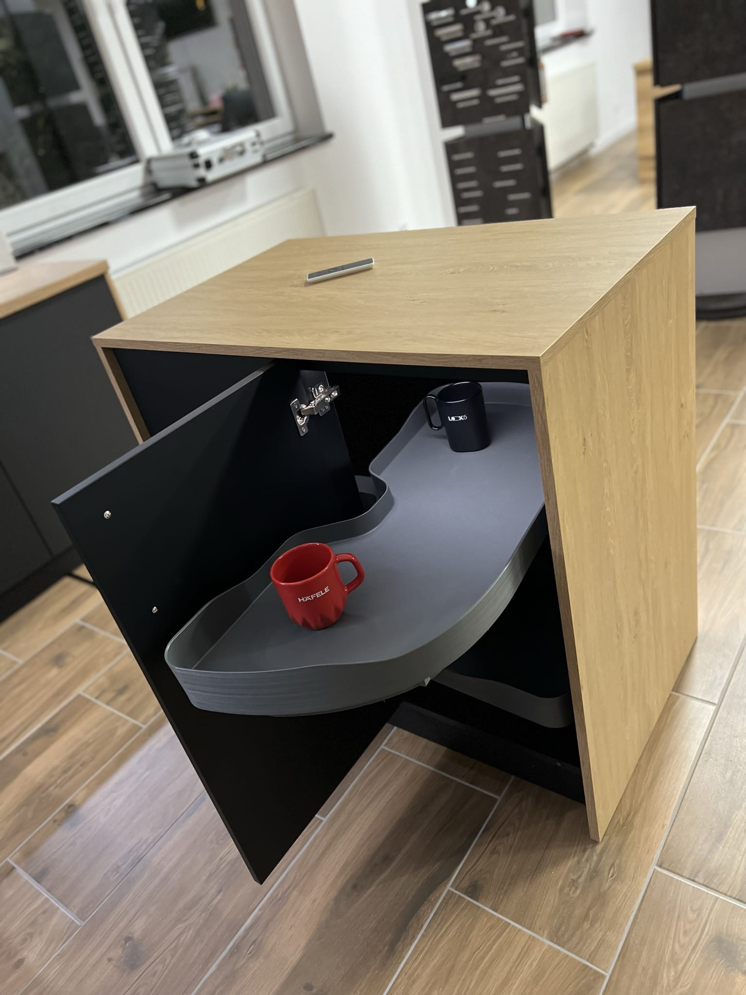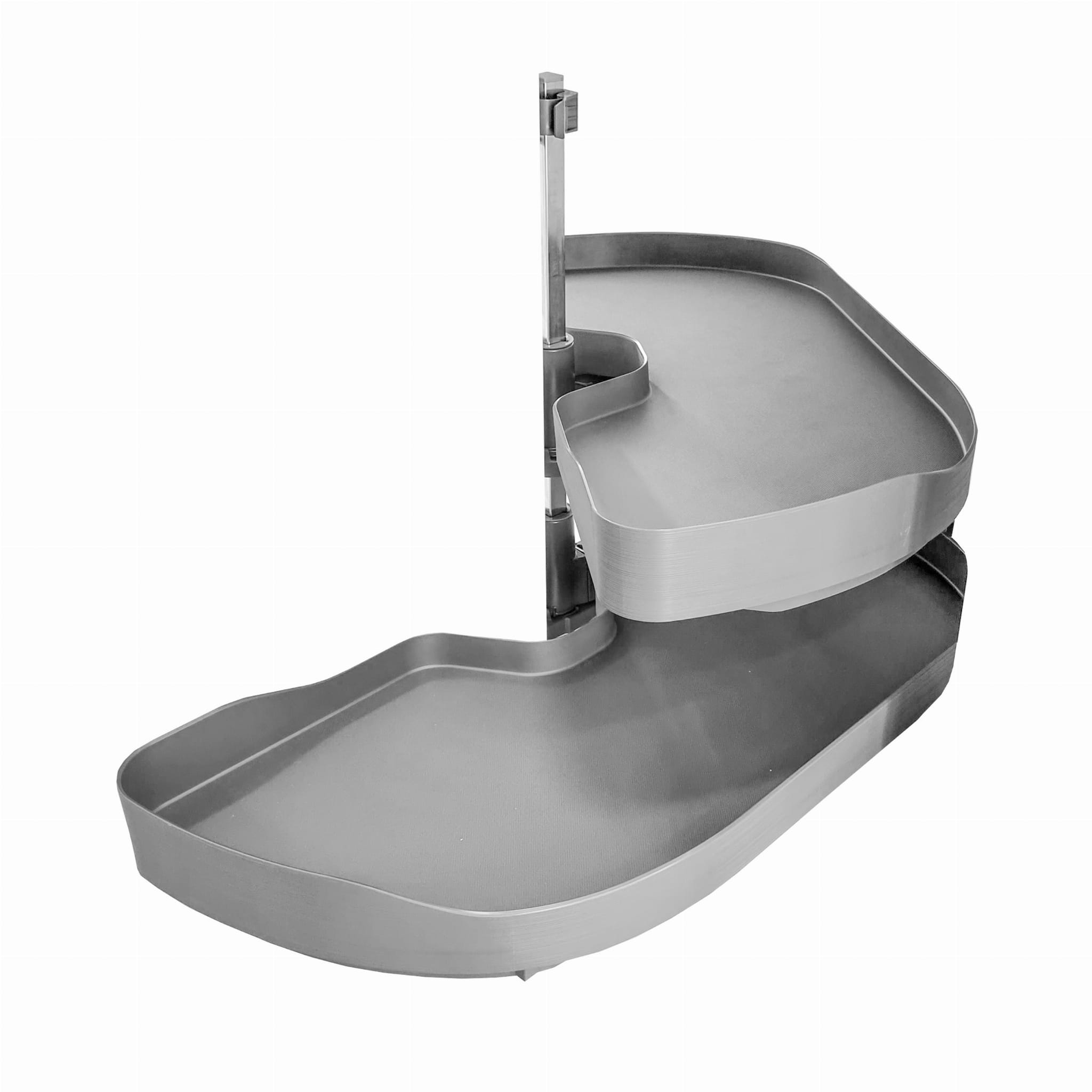- 2x obrotowe tace popychacze z ogranicznikiem poślizgu, górna półka z regulacją wysokości Podłoga z tworzywa Polystrol biała lub ciemnoszara z folią antypoślizgową