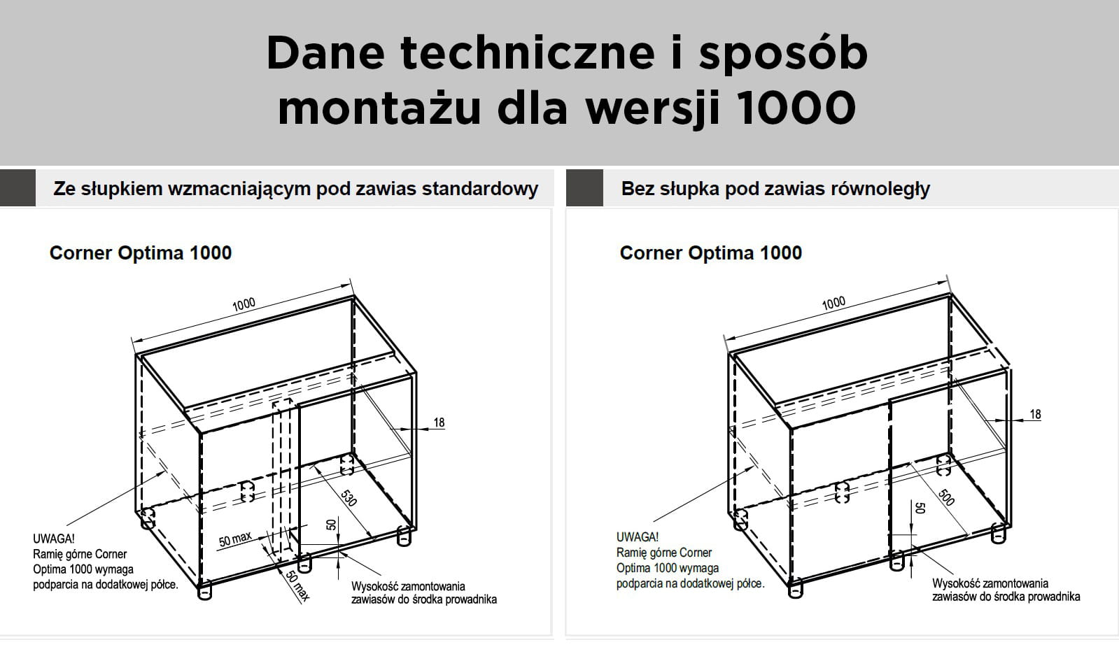 - montaż do szafki narożnej z frontem na zawiasach standardowych lub równoległych