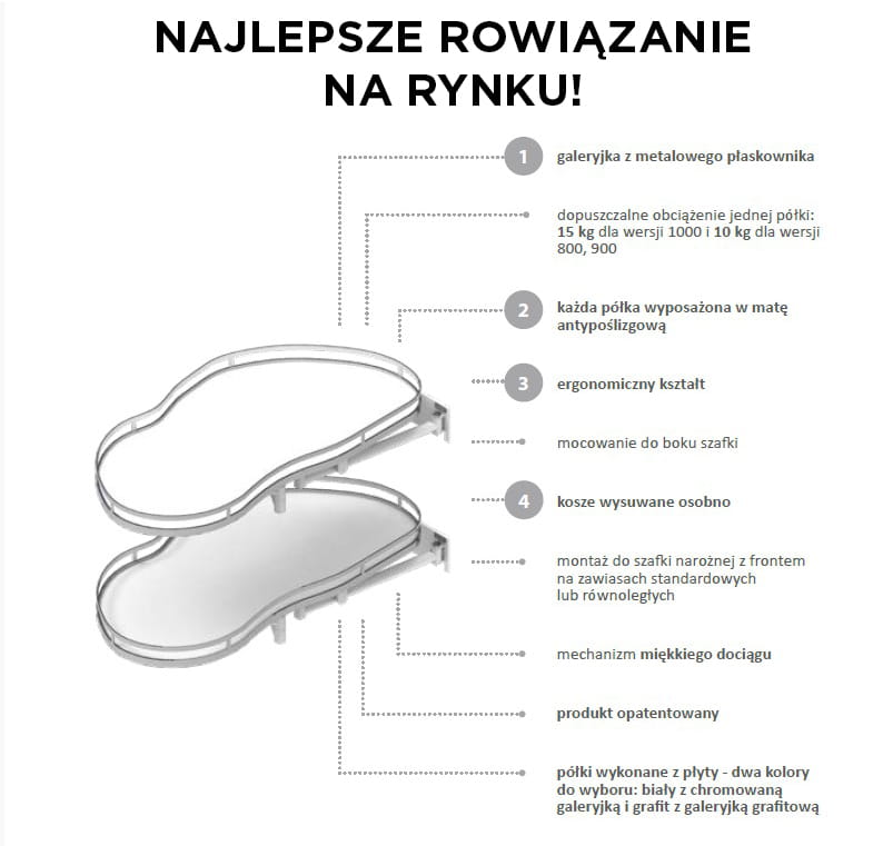 Półki wysuwane typu nerka do szafki narożnej o szerokości 80 cm z frontem 45 cm wysuwane w prawą stronę