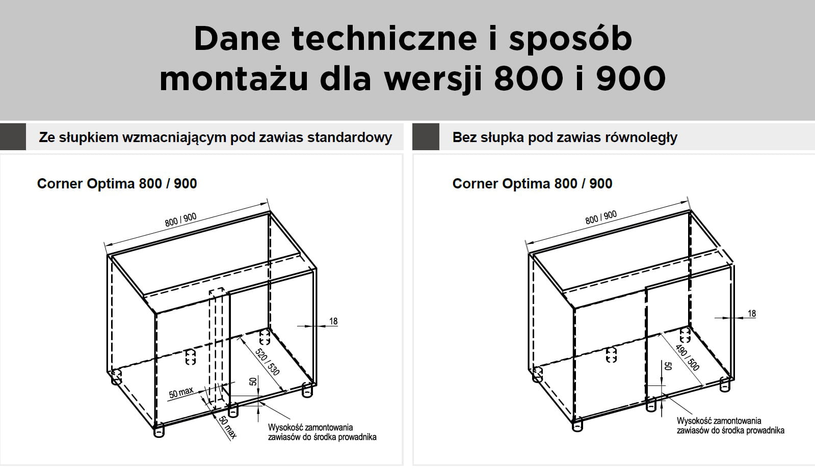 - montaż do szafki narożnej z frontem na zawiasach standardowych lub równoległych