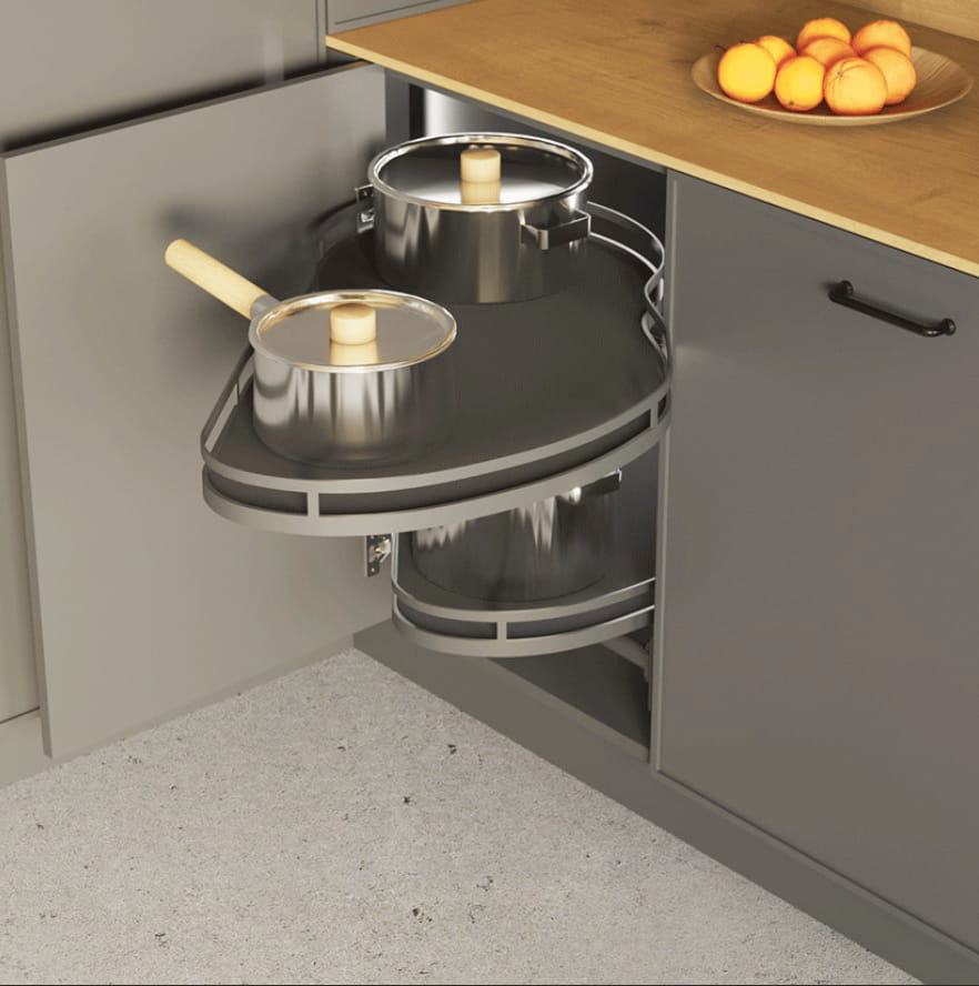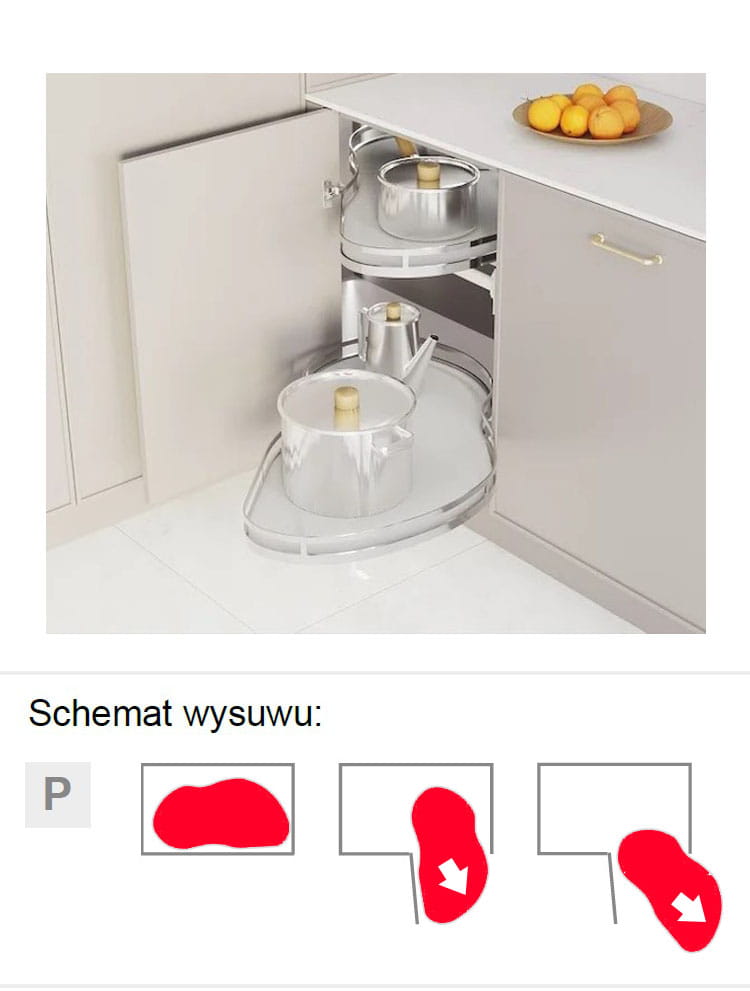 Półki wysuwane typu nerka do szafki narożnej o szerokości 90 cm z frontem 50 cm wysuwane w prawą stronę