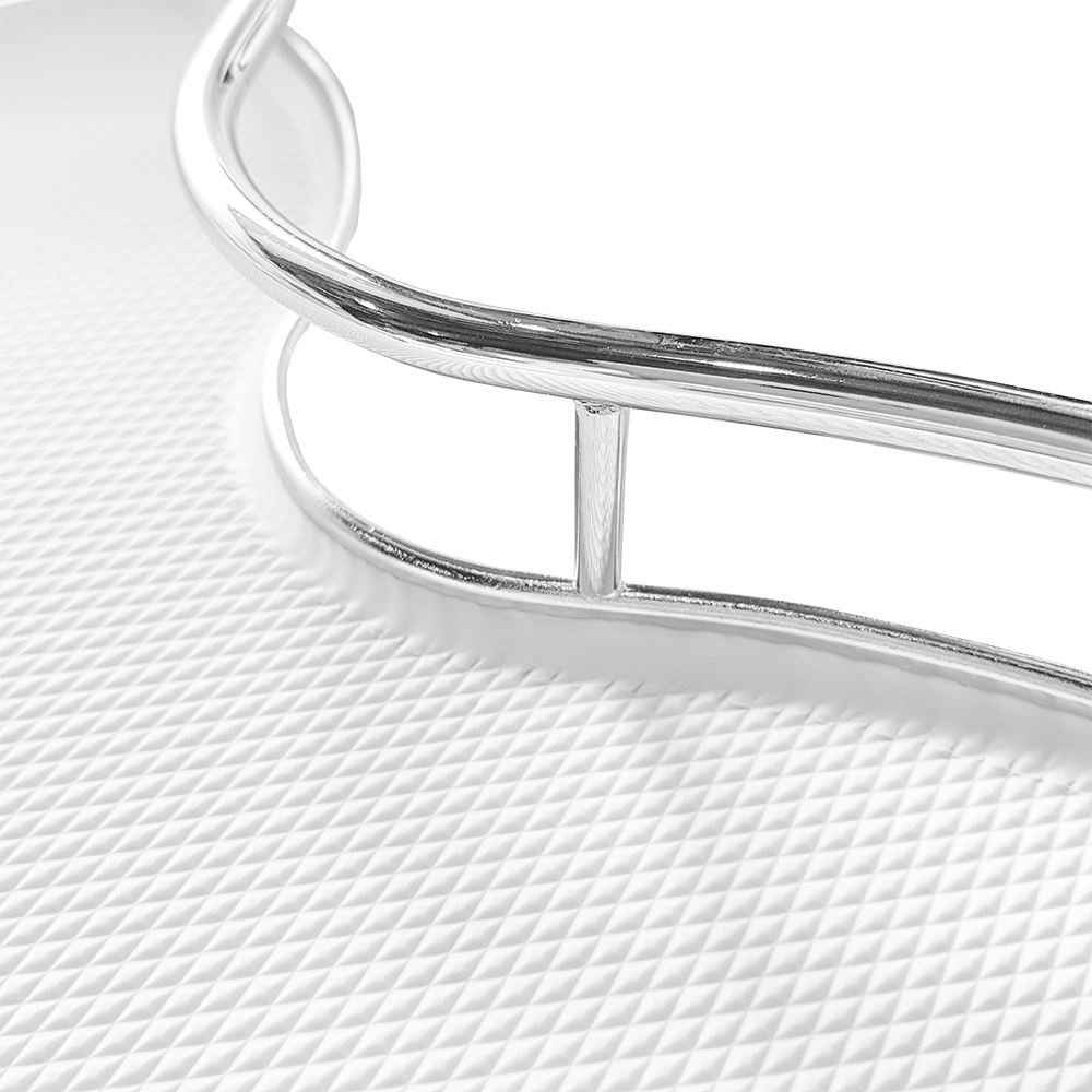 - Kolor: Biały z okrągłym chromowanym relingiem
