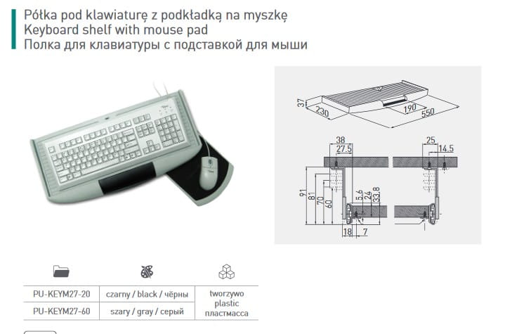 Półka z tworzywa sztucznego posiada kieszonkę na długopisy oraz suwak pozwalający przytrzymać klawiaturę w miejscu. Mocowanie półki odbywa się poprzez wkręcenie blaszek do blatu, nie trzeba robić boków z płyty wiórowej.