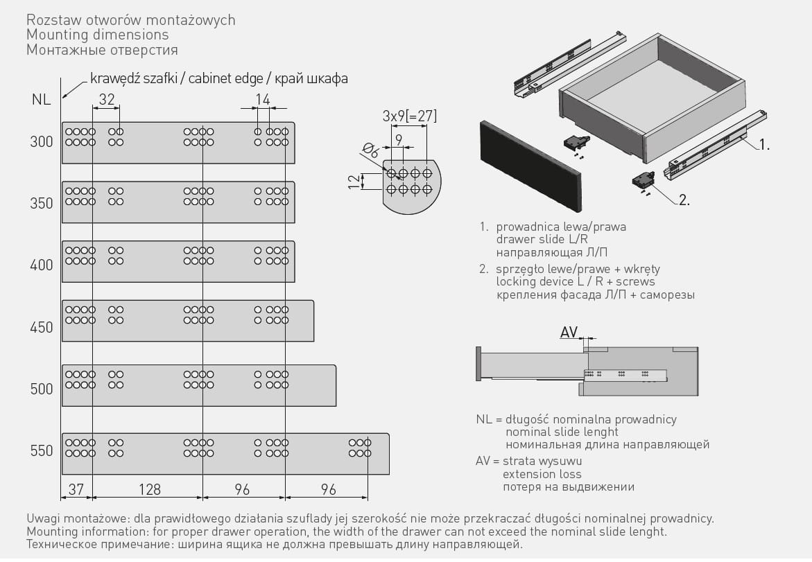 - Zaleca się montaż, w którym szerokość szuflady nie przekracza długości nominalnej prowadnicy.