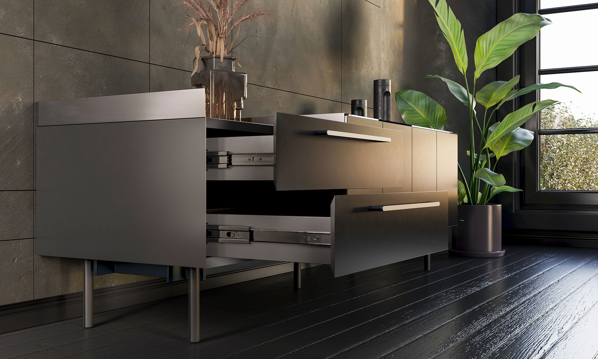 Prowadnice Versalite Plus+ to sprawdzona trwałość - certyfikat SGS na 80 000 cykli. Pełny wysuw umożliwia dostęp do całej głębokości szuflady a mechanizm soft close doskonale wpływa na komfort i ergonomię o każdej porze dnia.