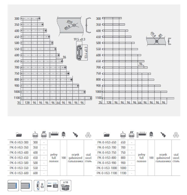 Prowadnica kulkowa dzięki swojej budowie zapewnia płynność wysuwania szuflady. Nowa konstrukcja wsparta większą wysokością - H 53 mm pozwala na duże obciążenie szuflady do max. 100 kg. Pełny wysuw pozwala na swobodny dostęp do zawartości szuflady i wysunięcie jej całej z obrębu korpusu mebla. Demontaż szuflady odbywa się poprzez uniesienie w obu prowadnicach elementów wyczepiających prowadnicę. Zastosowana w produkcji stal oraz ocynkowane wykończenie zapewniają bardzo wysoką wytrzymałość oraz estetykę elementu. Prowadnice sprawdzą się jako akcesorium do mebli metalowych, szuflad na ciężkie narzędzia.