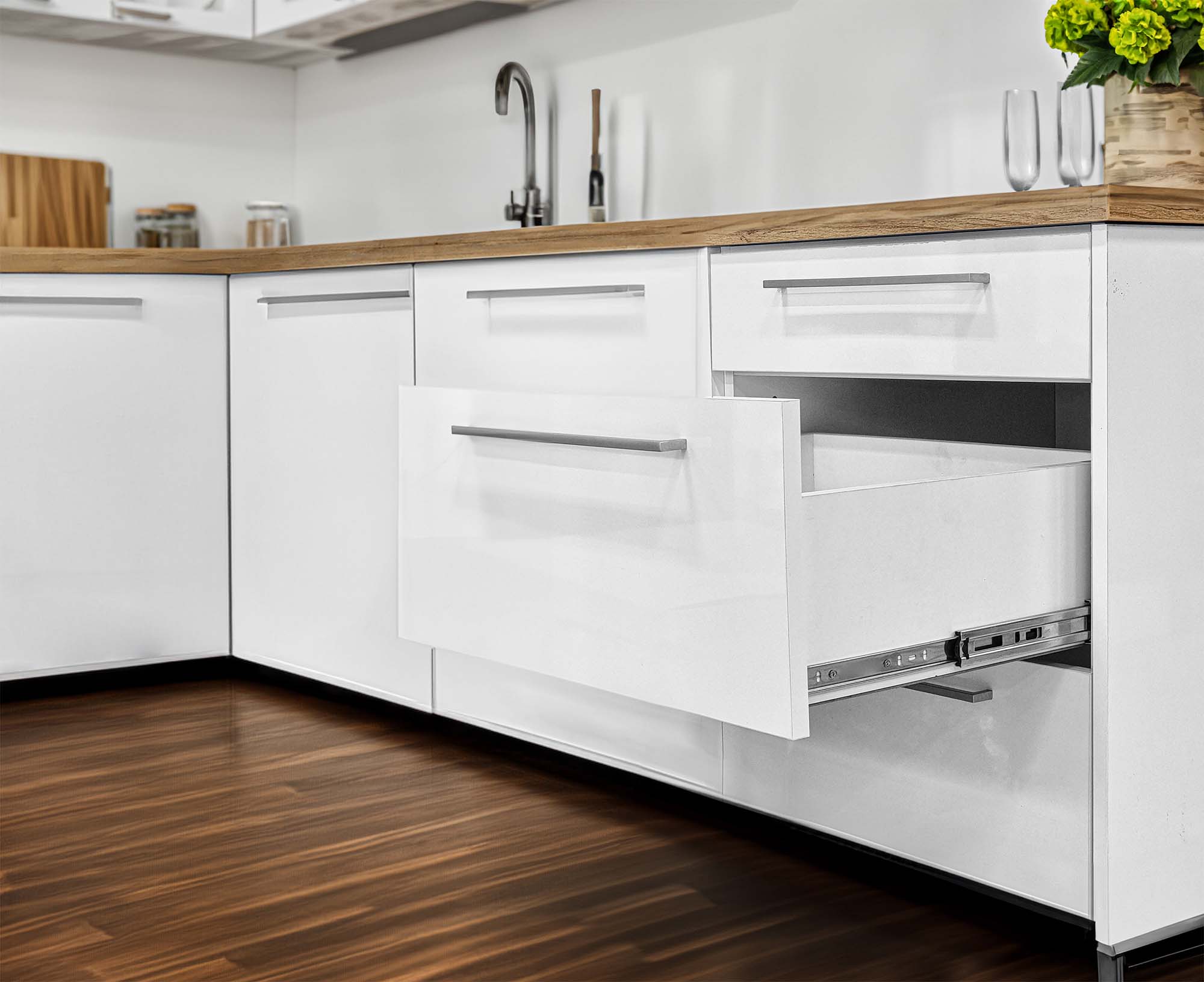 Prowadnica kulkowa o długości 500 mm gwarantuje niezawodność i wytrzymałość, montowana do boków stanowi bardzo mocne połączenie z korpusem. Prowadnice zapewniają udźwig do maksymalnie 30kg co pozwala na swobodne umieszczanie w szufladach nawet ciężkich rzeczy.