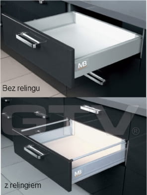 Reling stosowany jest w celu podniesienia boku szuflady i wzmocnienia stabilności frontu. Przy użyciu mocowania relingu do podwyższonej ścianki tylnej, reling można osadzić w dowolnej wysokości.