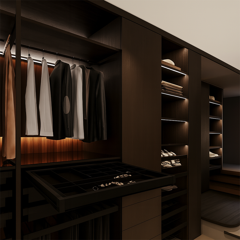 Szuflada GTV ELITE, organizer na biżuterię, cichy domyk, czarny to elegancki organizer z aksamitną wyściółką i cichym domykiem, idealny do przechowywania pierścionków, kolczyków i akcesoriów. Pełny wysuw i regulowana szerokość ramy zapewniają wygodę użytkowania i łatwy montaż w garderobie.