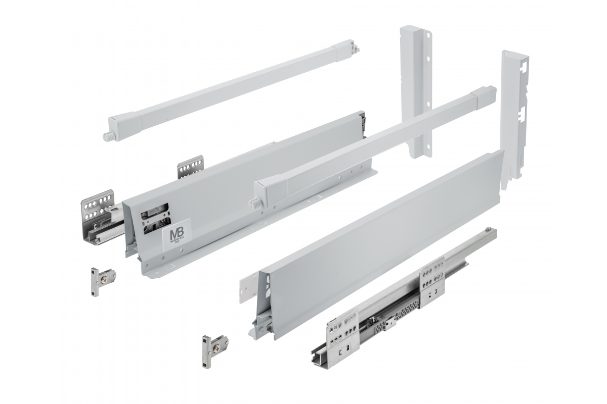 | Zawartość zestawu | 2 szt. prowadnica (L + P), 2 szt. bok szuflady (L + P), 2 szt. złączka ściany tylnej (L + P), 2 szt. złączka frontu, 2 szt. zaślepka |