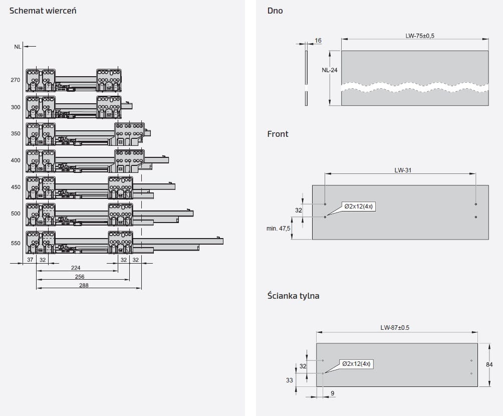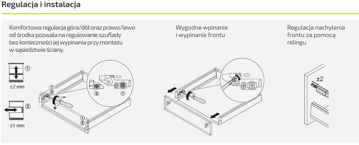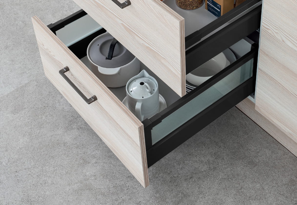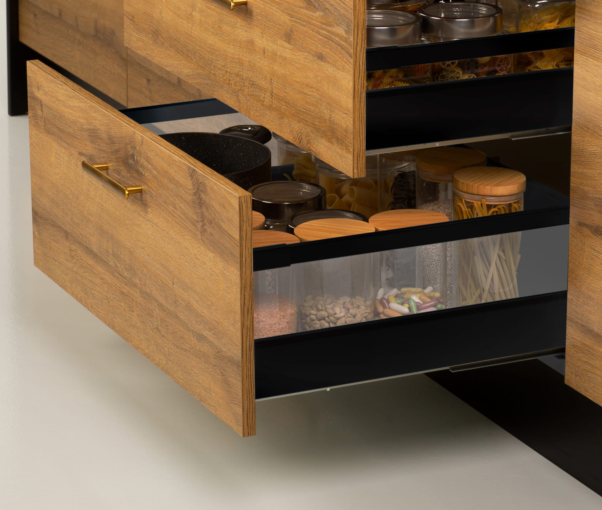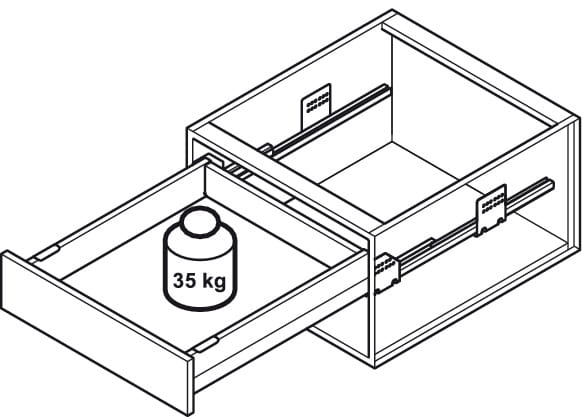 System boków szuflad matrix S35 zapewnia szybki montaż a zastosowany w prowadnicach precyzyjny system cichego domyku gwarantuje płynne i przyjemne użytkowanie szuflad. Wytrzymałe elementy i maksymalny udźwig szuflady 35kg sprawiają, że mogą być w niej przechowywane nawet ciężkie przedmioty - to wszystko przy zachowaniu płynności działania systemu.
