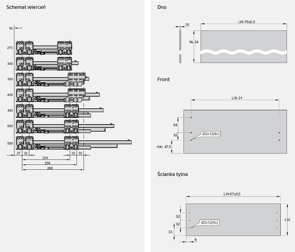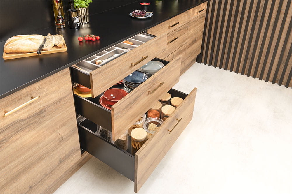 Szuflady Matrix S Slim zwiększają powierzchnię funkcjonalną mebli. Idealnie proste i cienkie boki (13 mm) sprawiają, że pojemność szuflad jest większa, przy jednoczesnym zachowaniu stabilności konstrukcji oraz udźwigu do 35 kg. Cztery wysokości boków pozwalają na elastyczne i wszechstronne zastosowanie systemu od kuchni po garderobę.