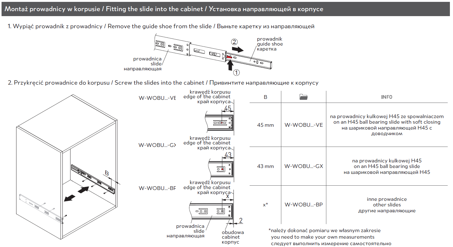 - Prowadnice kulkowe H45 z cichym domykiem