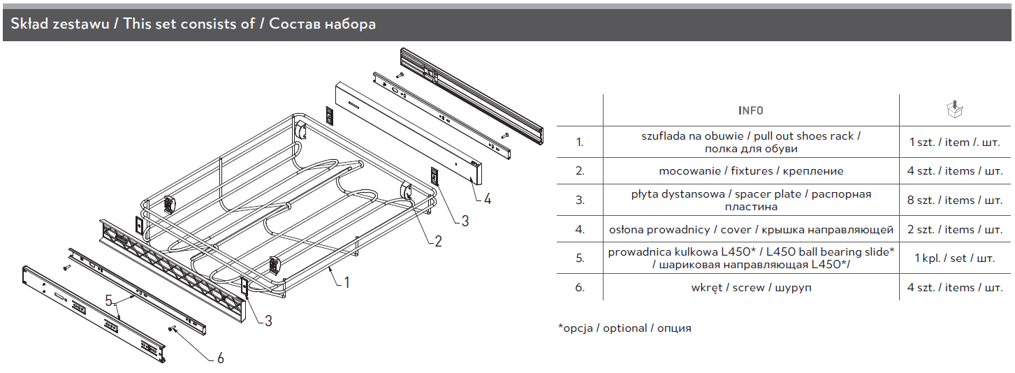 Szuflada na obuwie 700 mm, prowadnice kulkowe 45mm z spowalniaczem