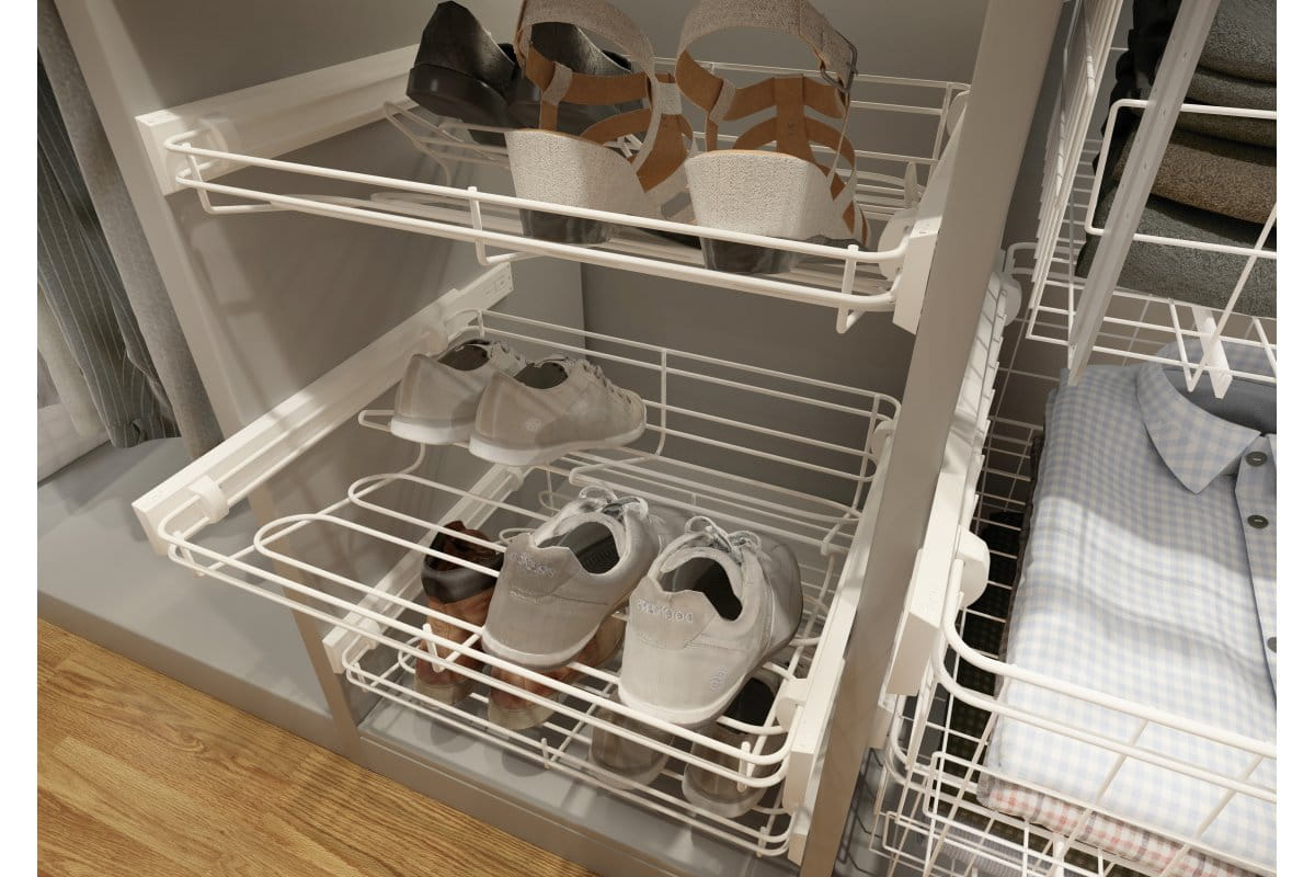 Praktyczna szuflada na buty umożliwi odpowiednie przechowywanie obuwia. Zestaw jest wyposażony w kosz druciany, dwie sztuki osłony prowadnicy, cztery komplety mocowania kosza oraz wkręty. Produkt jest komplementarny do prowadnicy kulkowej GTV H45, niezawartej w zestawie.