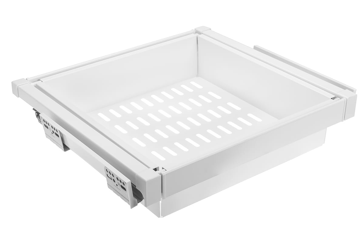 Praktyczna szuflada umożliwi odpowiednie przechowywanie w Twojej garderobie. Zastosowane w szufladzie prowadnice posiadają funkcję cichego domyku co zapewni wysoki komfort użytkowania oraz wytrzymałe mocowanie w korpusie szafki.
