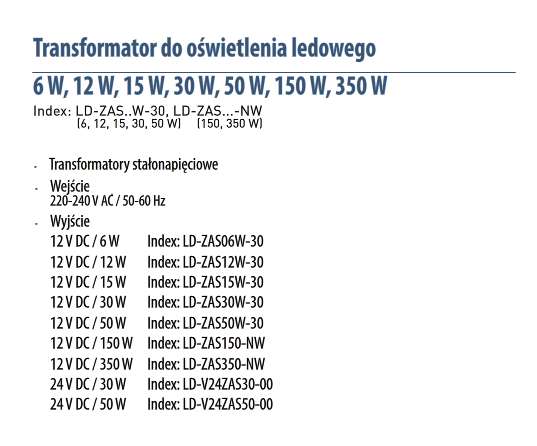 • Zasilanie, wejście - 230V AC / wyjście - 12V DC.
