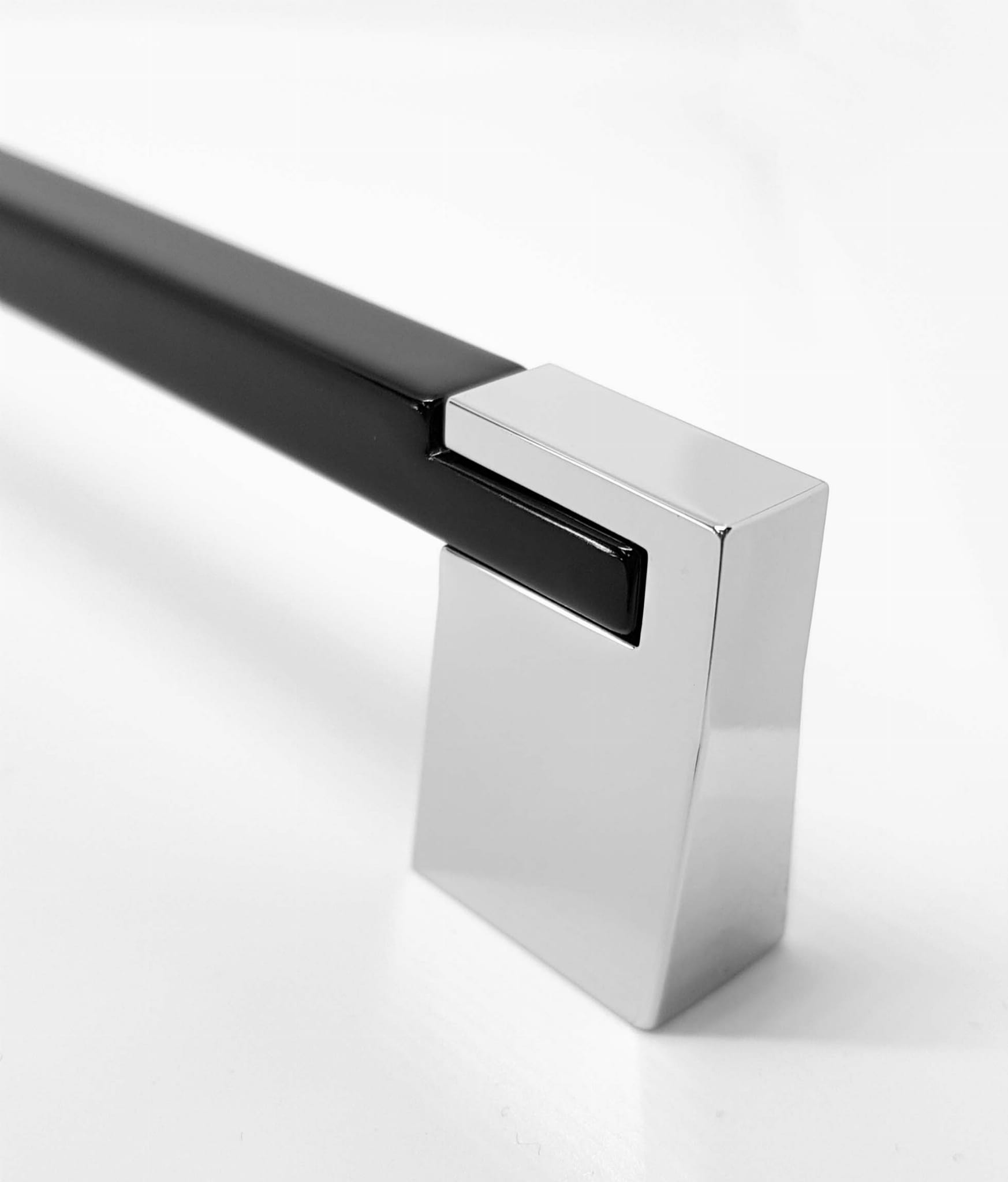 Uchwyt meblowy w niezwykle nowoczesnej stylistyce. Eleganckie i starannie wykończony w połączeniu dwóch kolorów o wysokim połysku - czarnego oraz chromu doda Państwa meblom designu i podkreśli ekskluzywność mebla