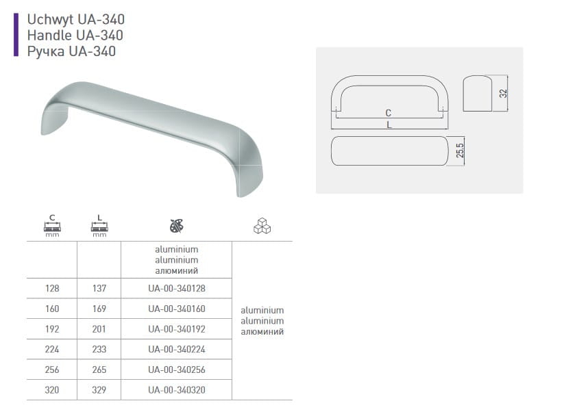 Uchwyt meblowy UA-340, aluminium mat, 192mm