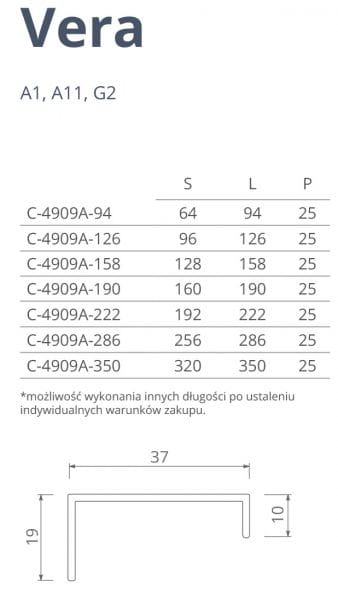 Uchwyt meblowy krawędziowy VERA C-4909A, biały połysk, 286mm