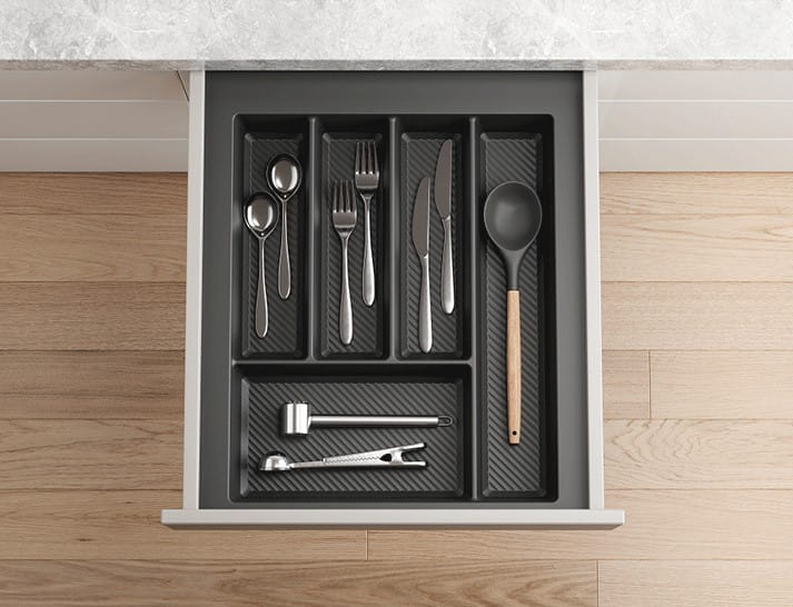 Wkłady organizery MAX to nowoczesne i praktyczne rozwiązanie do każdej kuchni. Dzięki specjalnej, ryflowanej strukturze dna cechują się wyjątkową trwałością, zapobiegają przesuwaniu się przedmiotów w trakcie otwierania szuflady oraz ułatwiają utrzymanie czystości.