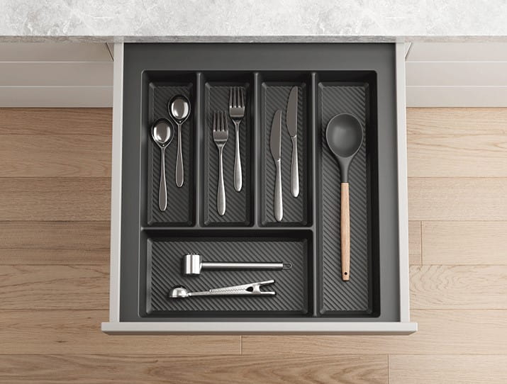 Wygodne przegrody – różne wymiary przegródek idealnie dopasowane do noży, łyżek, widelców czy akcesoriów kuchennych.