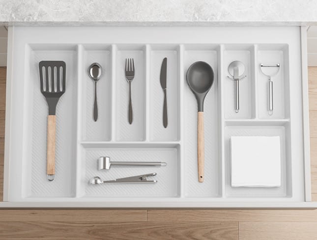 Wygodne przegrody – różne wymiary przegródek idealnie dopasowane do noży, łyżek, widelców czy akcesoriów kuchennych.