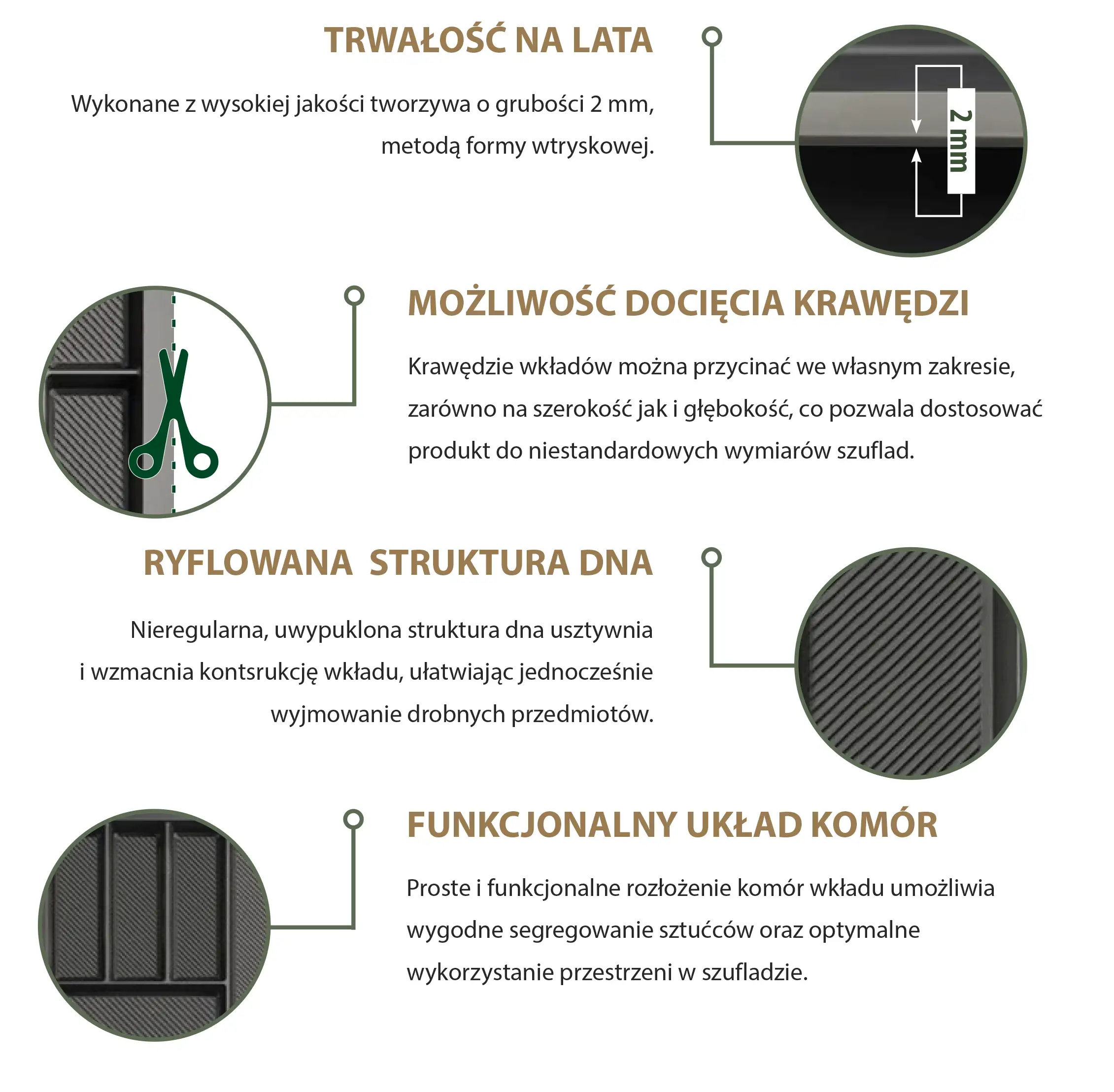 Możliwość docięcia – krawędzie wkładów można łatwo przycinać, aby dopasować je do niestandardowych wymiarów szuflady.