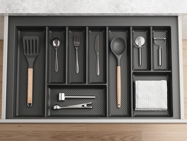 Wkłady organizery MAX to nowoczesne i praktyczne rozwiązanie do każdej kuchni. Dzięki specjalnej, ryflowanej strukturze dna cechują się wyjątkową trwałością, zapobiegają przesuwaniu się przedmiotów w trakcie otwierania szuflady oraz ułatwiają utrzymanie czystości.