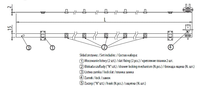 Zamek centralny meblowy do szuflad komplet, 800mm