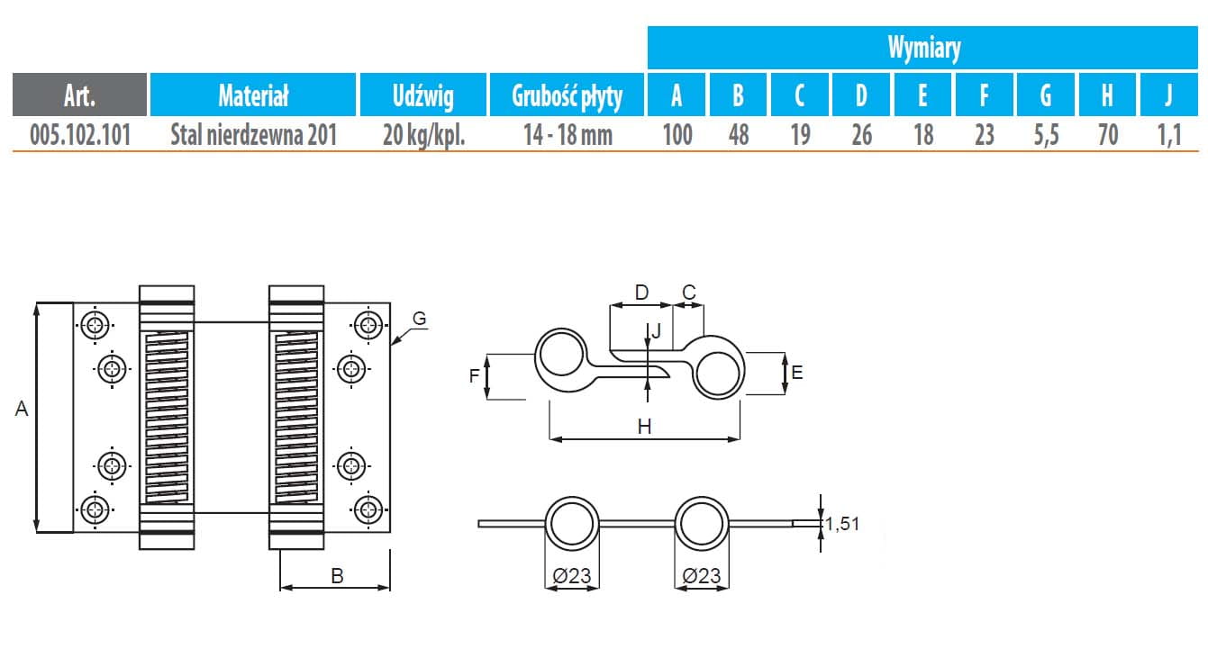 Zawias wahadłowy / saloon / dwustronny, 100mm, 20kg, kpl