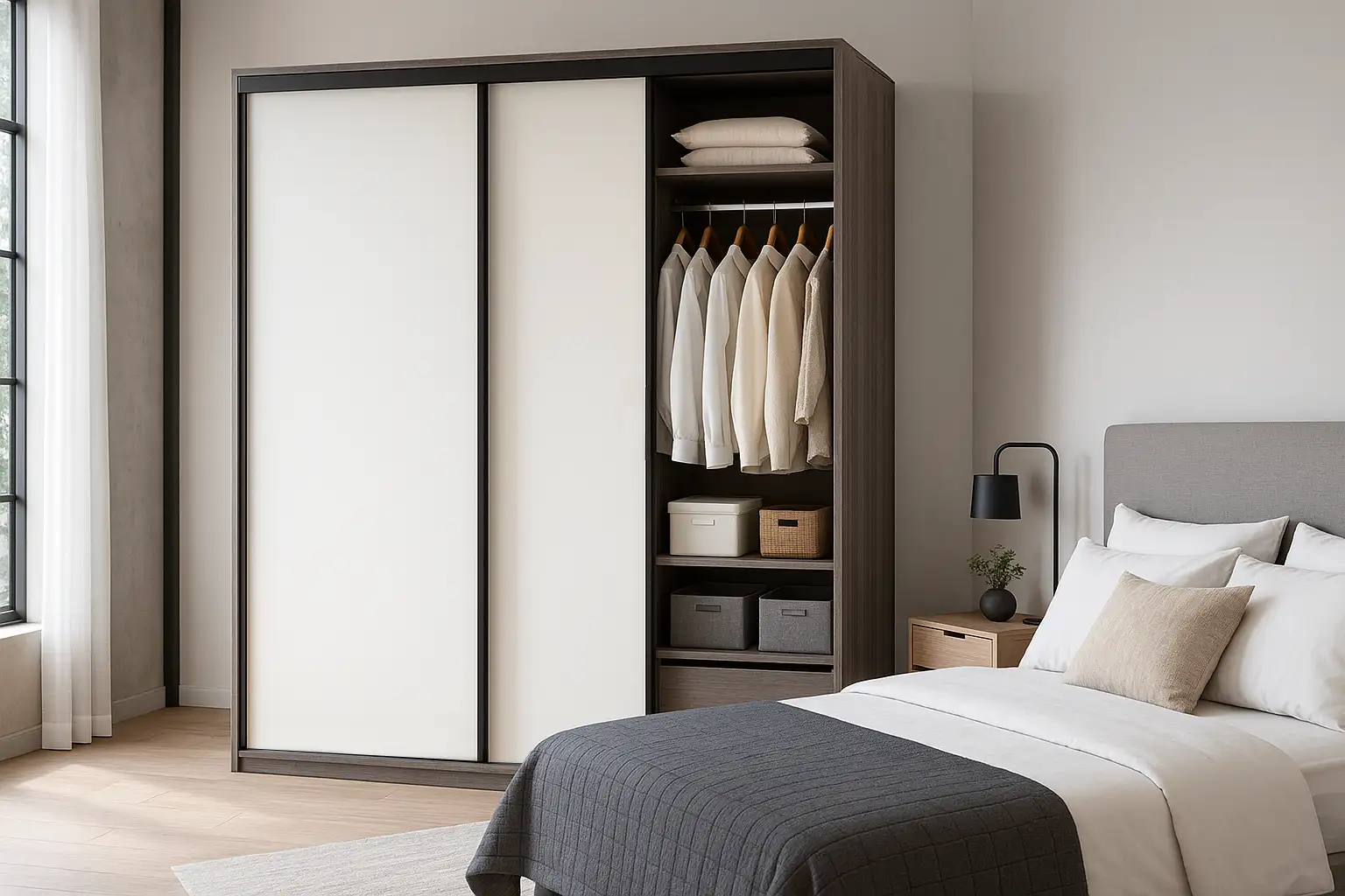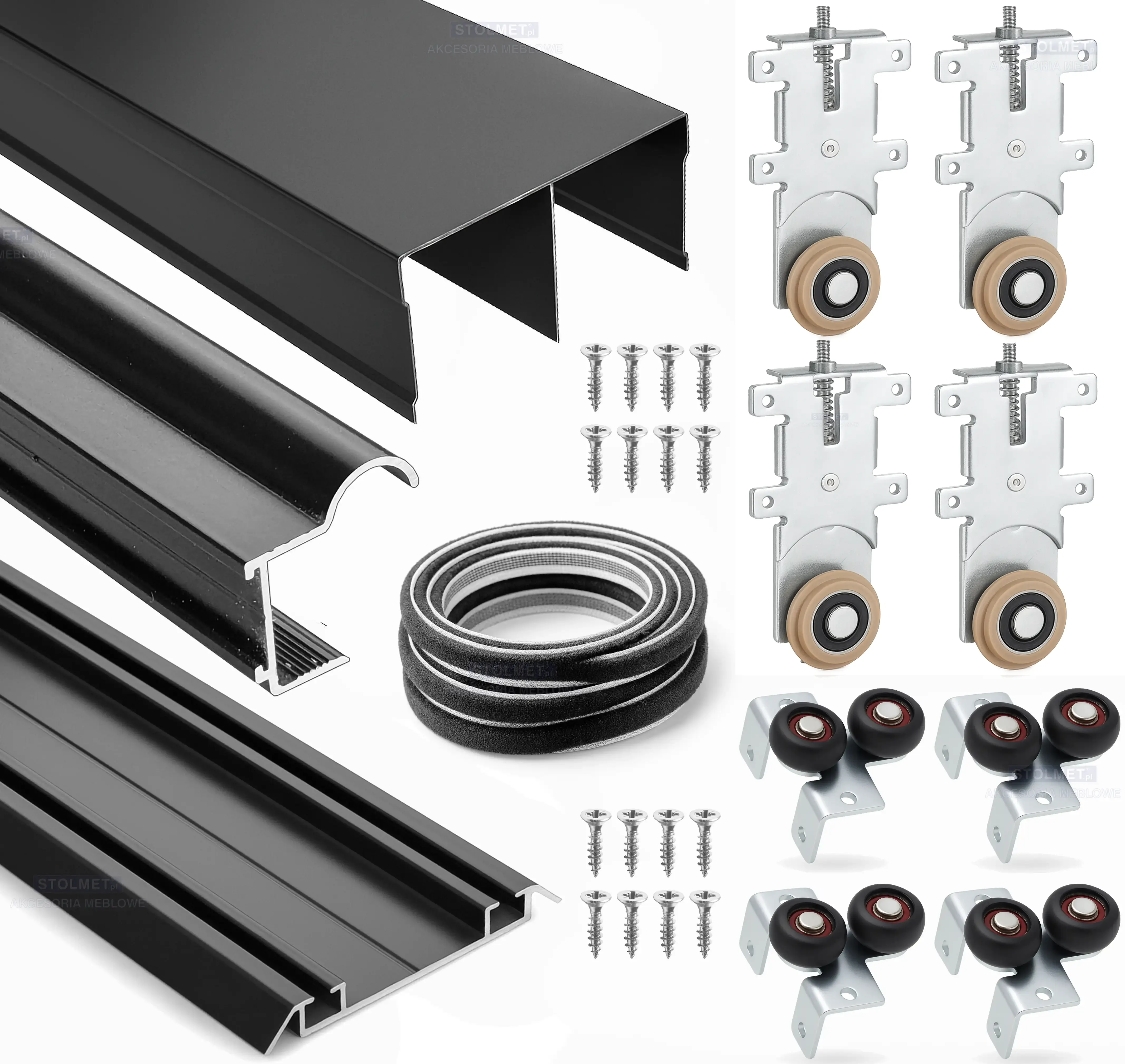 W skład zestawu wchodzą wszystkie profile i okucia które potrzebujesz do skręcenia drzwi przesuwnych.