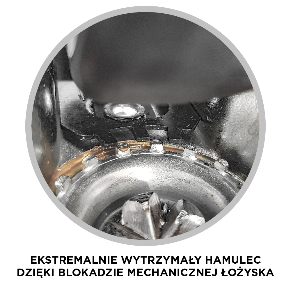 - Wbudowany bardzo mocny hamulec łożyskowy