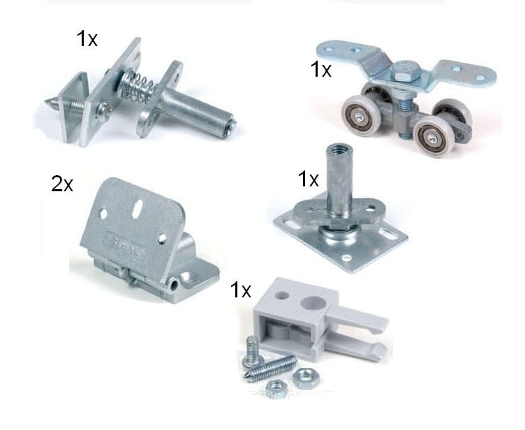 1 zestaw zawiera wszystkie potrzebne elementy do zamontowania 1 skrzydła (czyli dwóch drzwi). Wszystkie elementy oraz ich ilość pokazane są na zdjęciu.