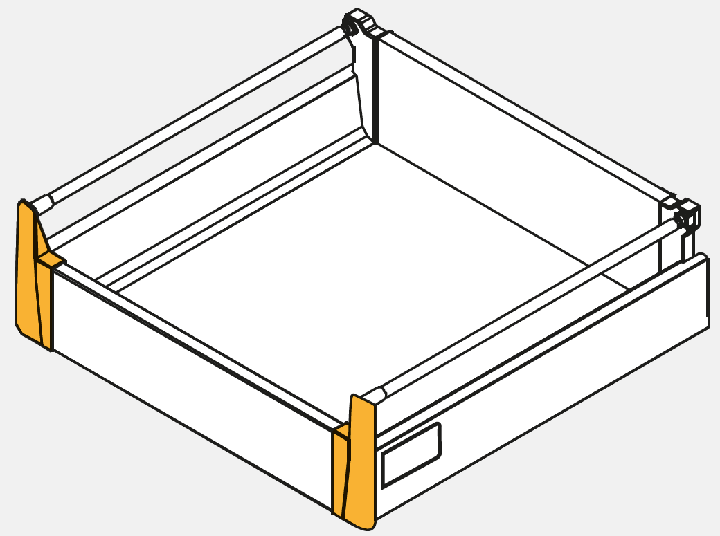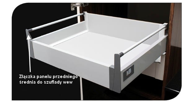 Złączka ta jest jednym z elementów szuflady wewnętrznej systemu Modern Box, za jej pomocą łączymy panel przedni z szufladą.