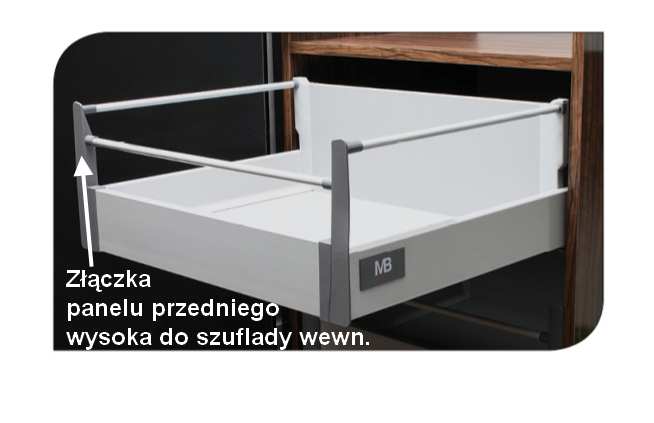 Złączka ta jest jednym z elementów szuflady wewnętrznej systemu Modern Box, za jej pomocą łączymy panel przedni z szufladą.