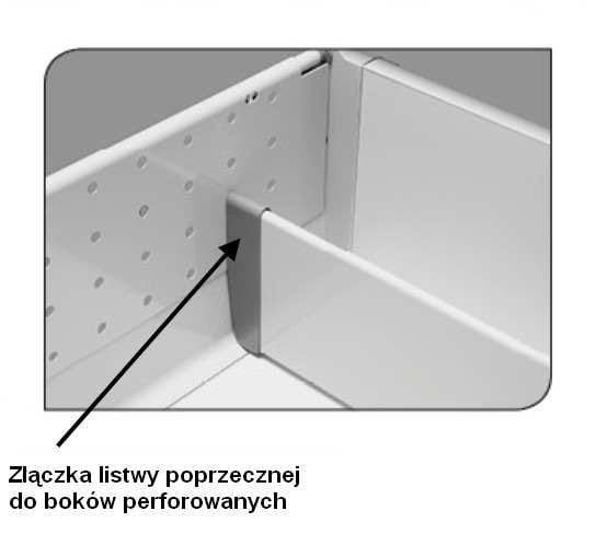 Złączka ta służy do połączenia listwy poprzecznej z bokami perforowanymi w systemie szuflad Modern Box, wpływa to na łatwą organizacje przestrzeni wewnątrz szuflady.
