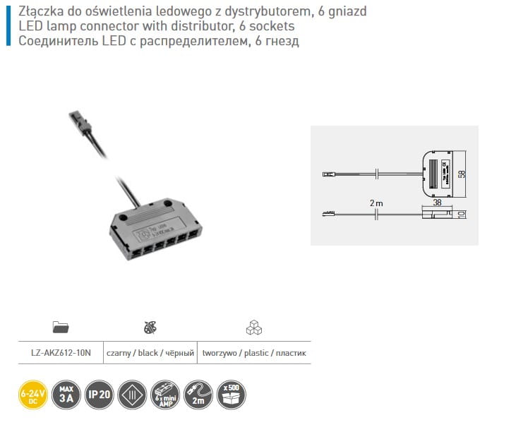 Złączka z dystrybutorem do oświetlenia LED, 6 x mini AMP, 2m